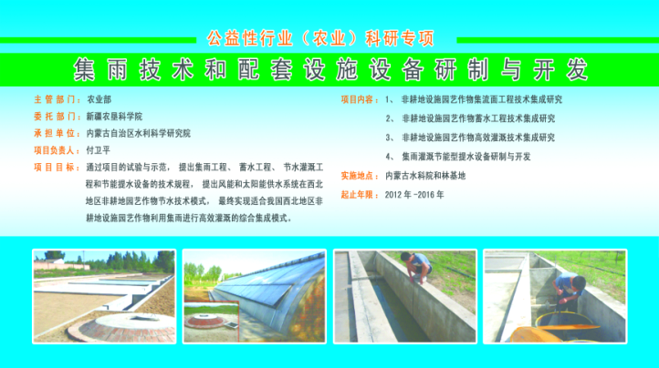配合新疆农垦科学院主持完成了该项目,开发出高效集蓄工程—“圈梁式橡塑水窖”针对砖、混结构雨水集蓄工造价高、施工难度大等问题,首次在农业领域开发出 75m3 的工厂定型生产、可装配安装的 大容积圈梁式橡塑水窖。与砖、混水窖相比雨水利用率提高 11.8%,投资较砖、混结构水窖降低 10.3%。研发出笼屉式环状挂篮沉淀井,针对雨水经集流面进入水窖前泥沙、杂物难处理问题,开发出工厂定型生产,可实现多层组合、过虑效果好的笼屉式环状挂篮沉淀井。解决了雨水初虑问题,该装置具有网格开敞式井盖设计,全环状滤网横向 360度过滤的特点,过滤速度提高 30%以上。创建了井窖结合雨水优先利用技术模式—基于集雨系统的光伏提水温室自动化控制的雨水优先灌溉水肥一体化技术集成模式并在内蒙推广应用,节水增产效果明显。